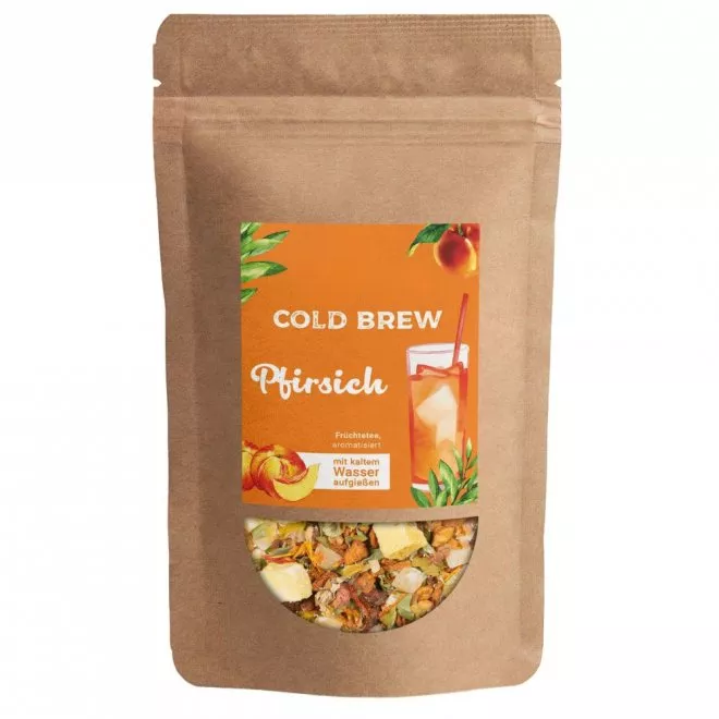 Cold Brew Tee, Pfirsich Tee, Früchtetee kalt aufgießen, veganer Tee, Sommertee, kalter Tee, Pfirsich Eistee, natürlicher Früchtetee, milder Tee, Tee ohne Konservierungsstoffe.